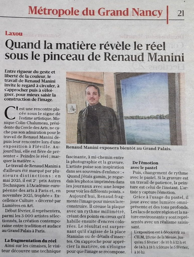 Incrustations pigmentaires ou Gravures Nouvelles Et peintures au pastels. Parution le 12/05/2025 dans l’Est RépublicainMANINI Renaud_ Exposition Peinture / Gravures Nouvelles Cafétéria Carrefour Houdemont ( Cora’ Art ) – 7 mai – 7 juillet 2025Affiche Exposition MANINI_ Fête de l’oeuf 2025_ Fléville Salle des SportsExposition Manini_ Fête de l’oeuf 2025_ Fléville devant Nancy, Salle des sportsManini Renaud_ Notre dame_ Art Capital-2019_Grand palais_ ParisLa pomme – Gravure Nouvelle colorée au pastel. Manini Renaud. Art Capital Paris 2018 – Grand Palais